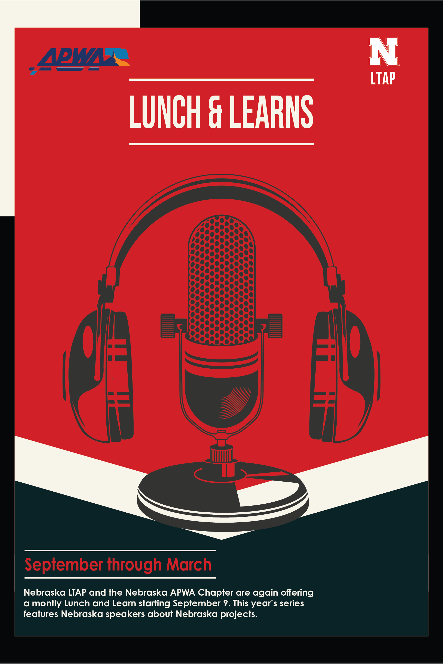 Nebraska LTAP and the Nebraska APWA Chapter are again offering a monthly Lunch and Learn starting September 9. This year's series features Nebraska speakers about Nebraska projects.